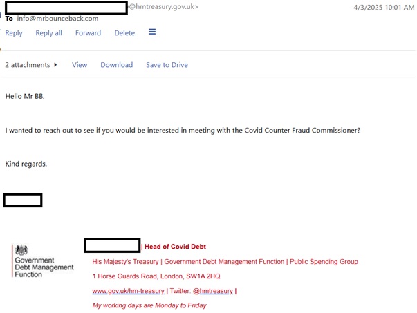 In April of this year HM Treasury invited me to meet with the Covid Corruption Fraud Commissioner as he wanted to “pick my brains” and “offer suggestions and feedback” into a new recovery scheme he had in mind that being the Voluntary Repayment Scheme.
