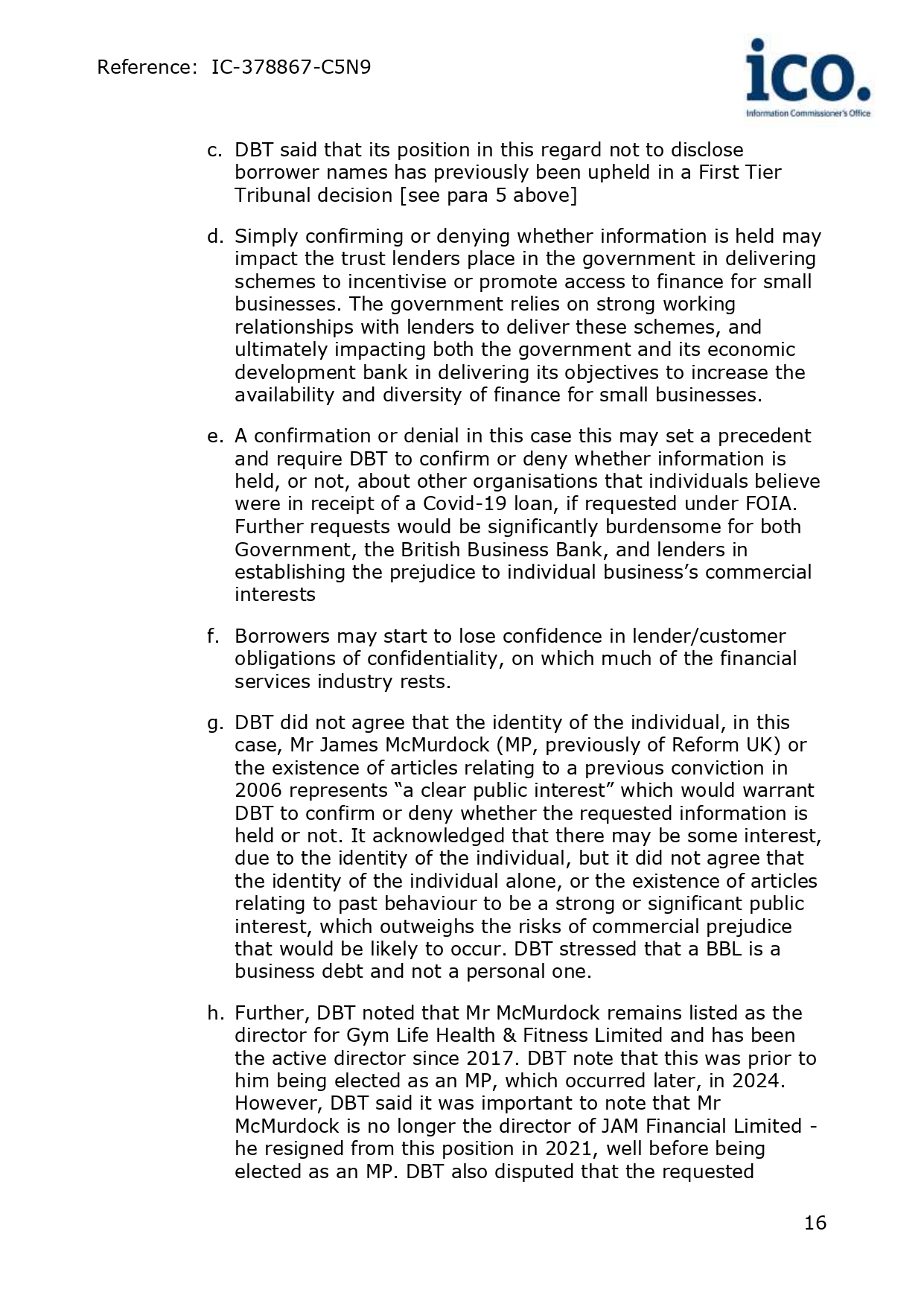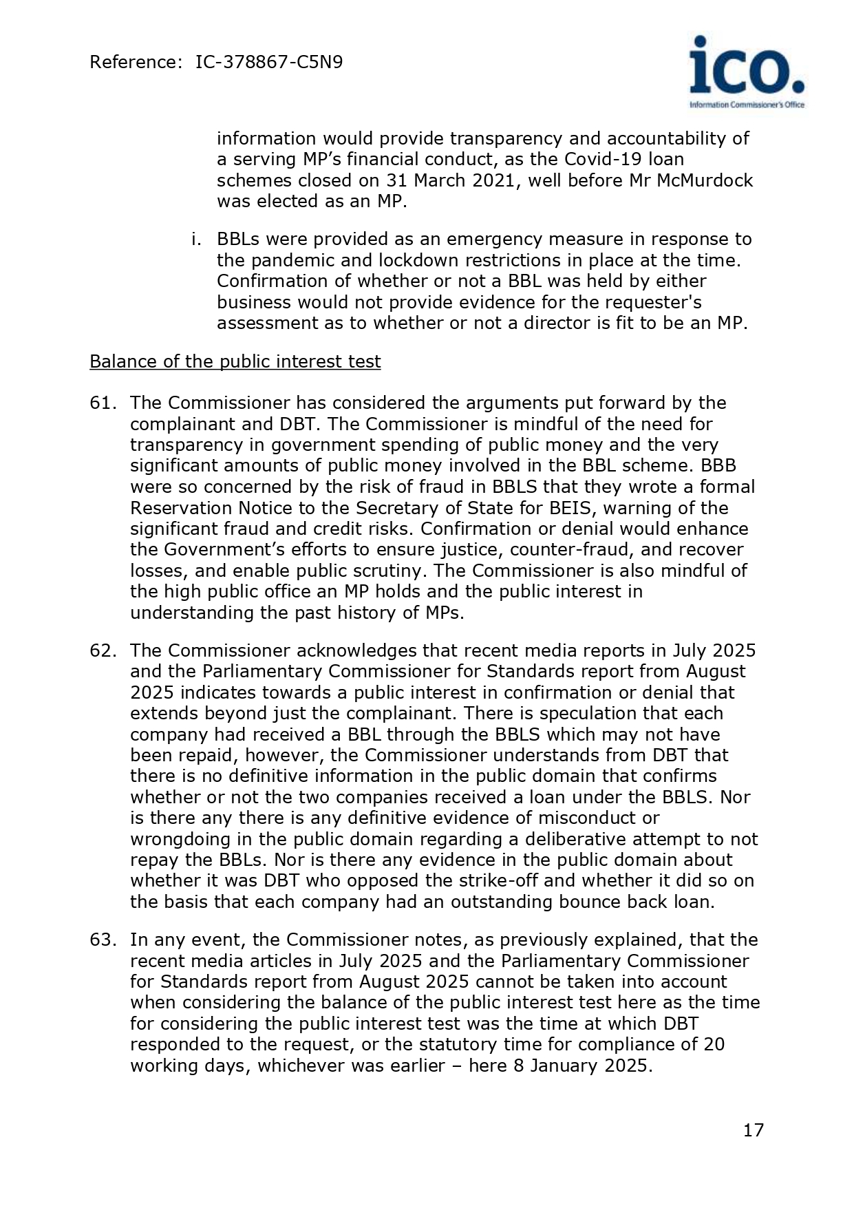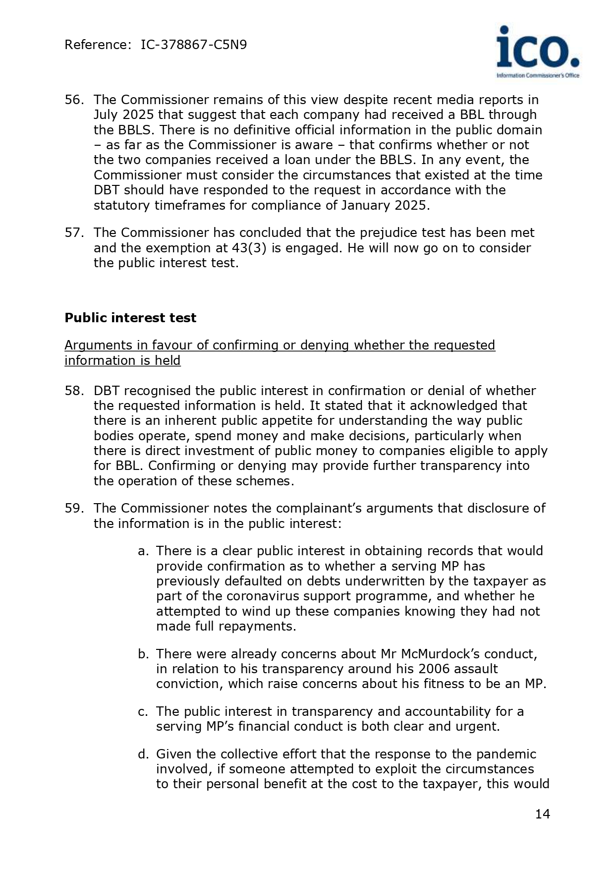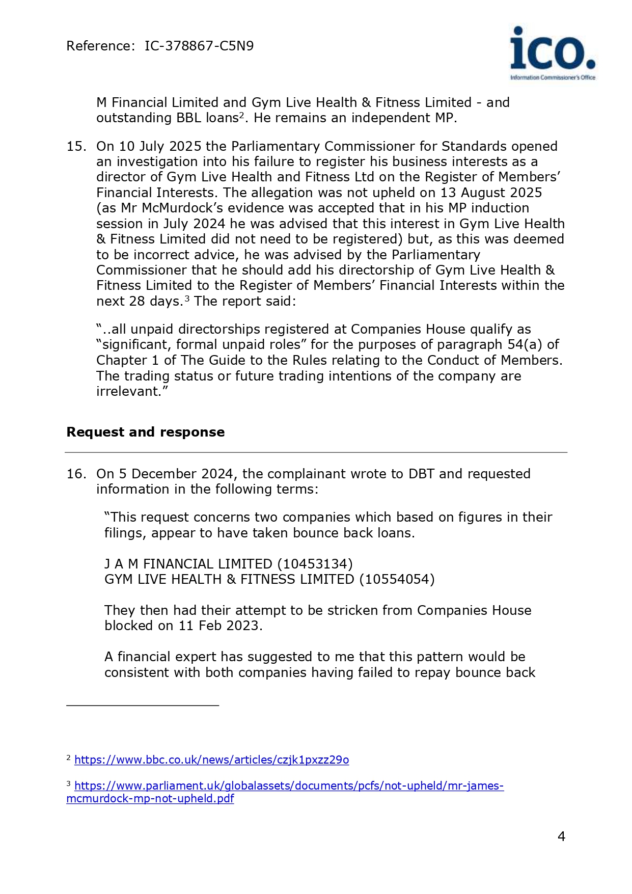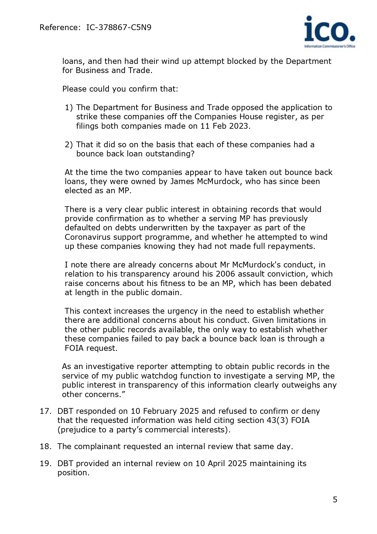 Now, much more recently, word got out that Companies linked to James McMurdock MP had got Bounce Back Loans, on which there are allegedly questions to be answered, and as such someone, I imagine one of the journalists sniffing around the story, decided to go to the Information Commissioners Office in the hope they would overturn the decision by the Department for Business and Trade to refuse to confirm or deny such, with Freedom of Information Requests they had submitted.