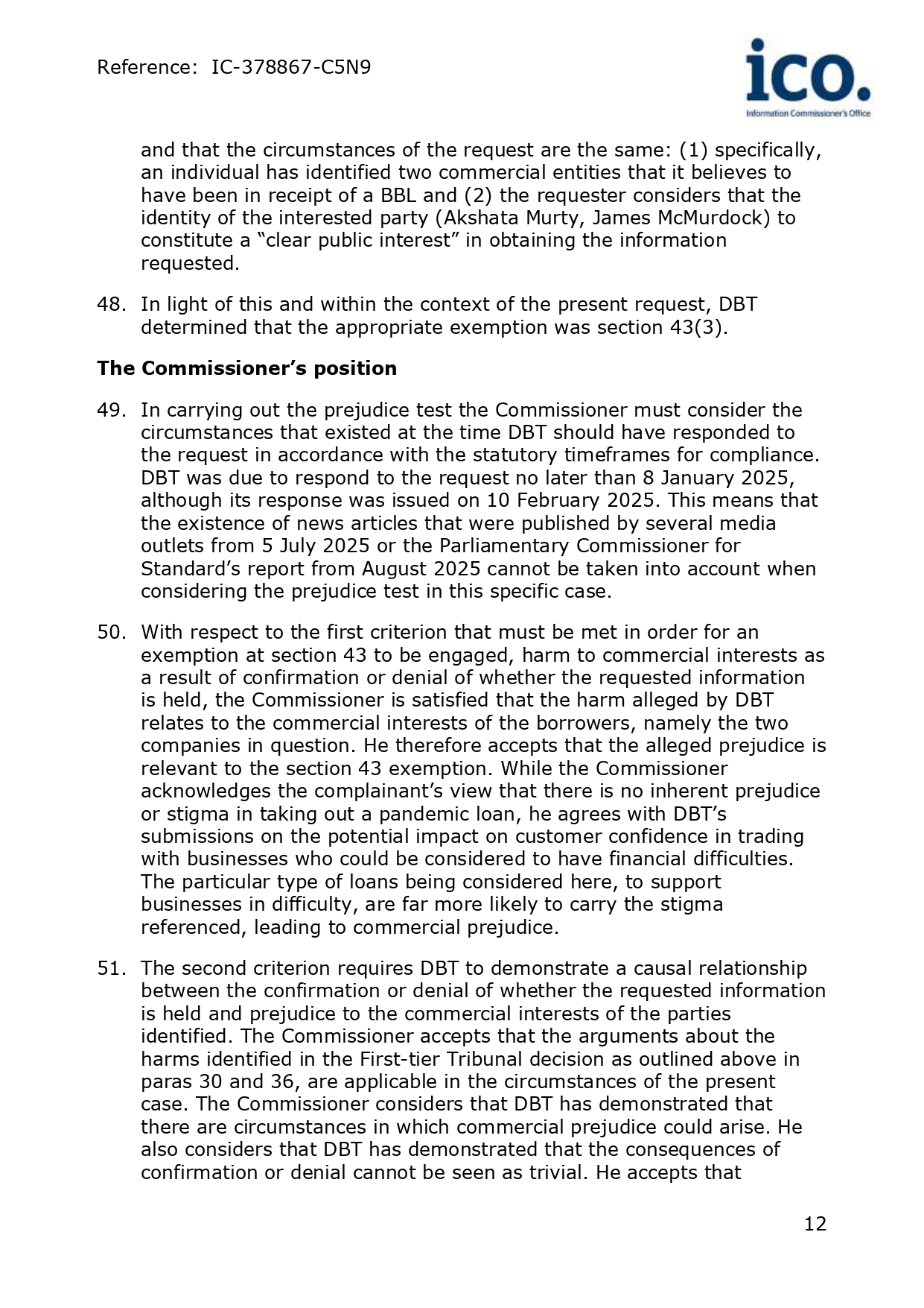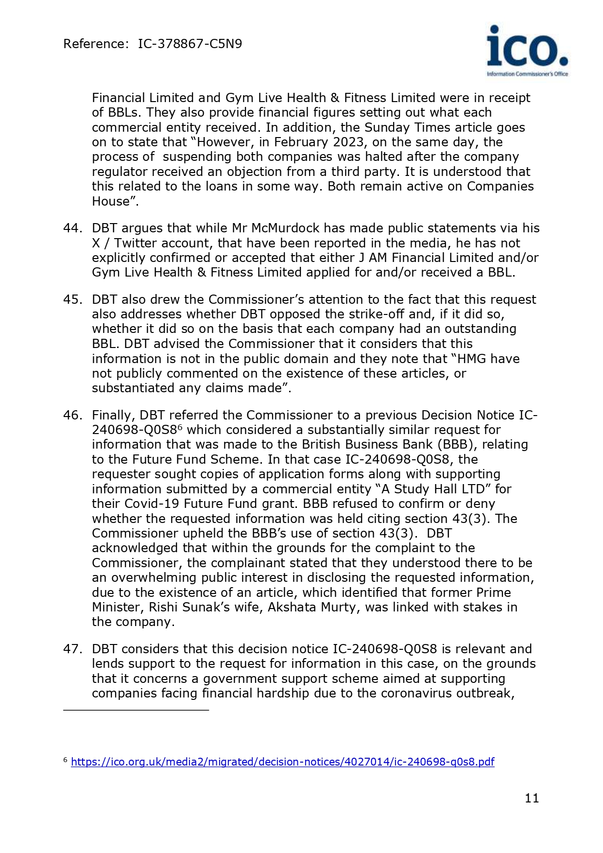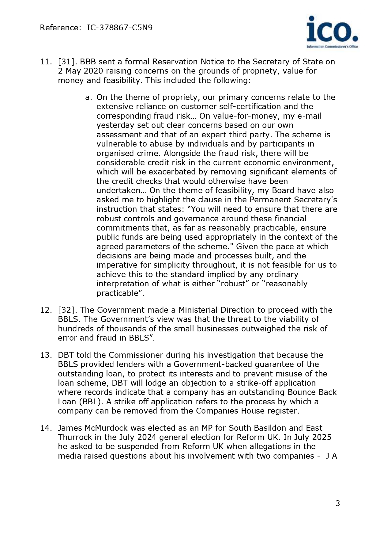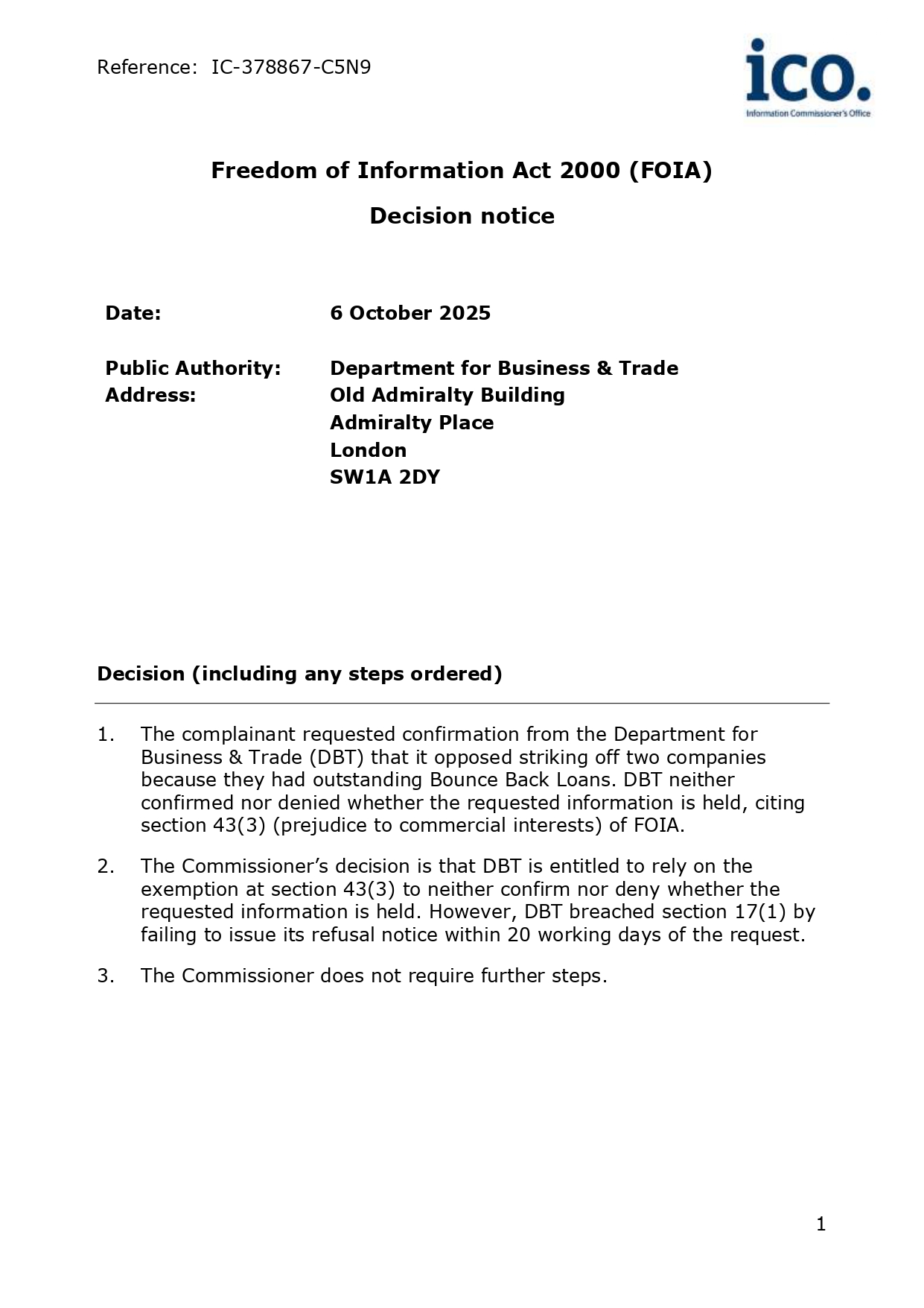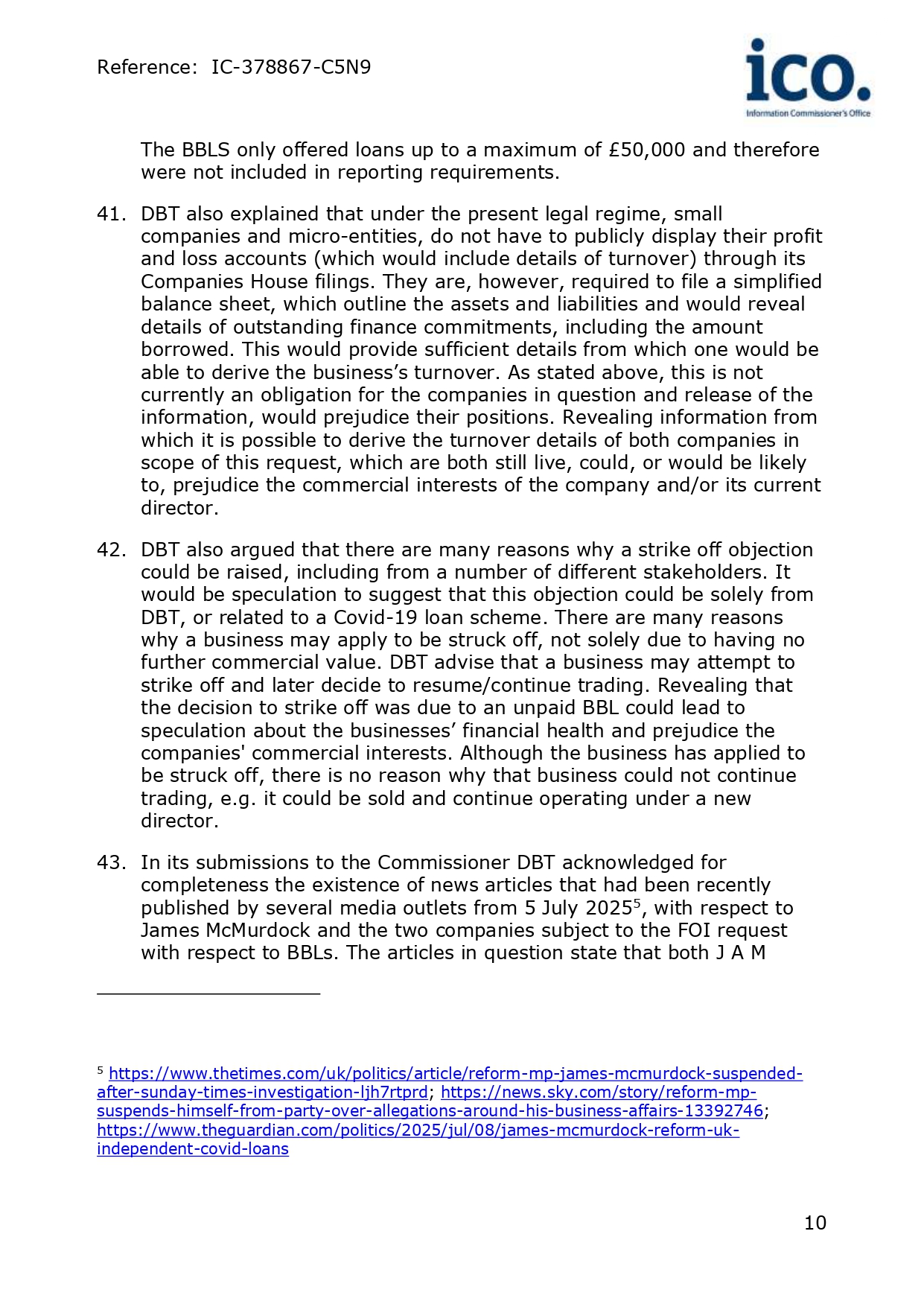 Now, much more recently, word got out that Companies linked to James McMurdock MP had got Bounce Back Loans, on which there are allegedly questions to be answered, and as such someone, I imagine one of the journalists sniffing around the story, decided to go to the Information Commissioners Office in the hope they would overturn the decision by the Department for Business and Trade to refuse to confirm or deny such, with Freedom of Information Requests they had submitted.